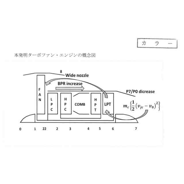 図1に本エンジンの概念図を示す。このエンジンは同じファン前面面積を持つ通常のターボファンより主ジェットノズル及びファンバイパスノズルの出口面積を大きく設定した機関である。主ジェットノズル面積を広く取ると高圧圧縮機(HPC)後流の抵抗が減少しHPC作動線がチョーク側に移動する。作動点の移動によりHPC流量が増すと燃料空気混合比が減少しTITが下がる。また面積が広い主ジェットノズルはエンジン背圧P7を下げ、ファン駆動タービンである低圧タービン(LPT)の膨張比を増すので、ファン吸込み空気量が増す。