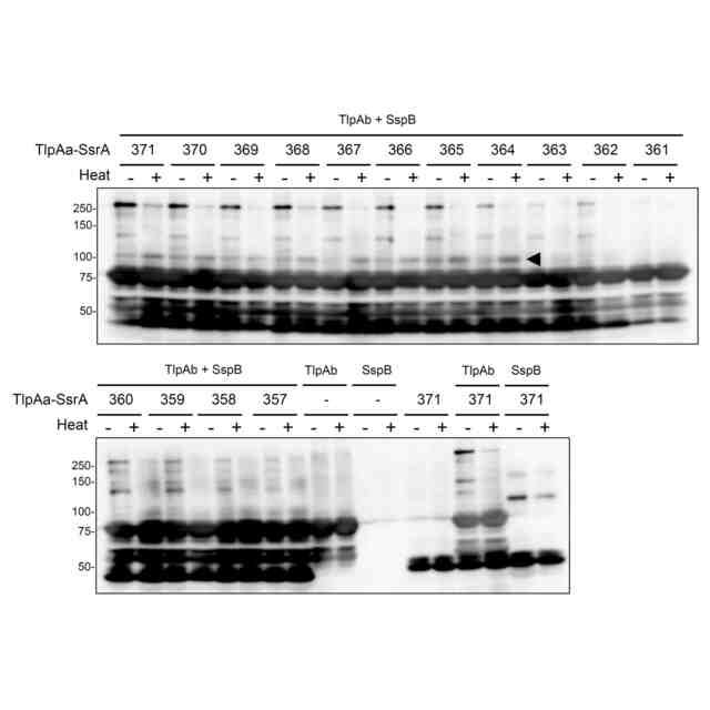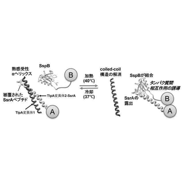 本発明にかかるタンパク質セットの作用機構の1例を図1に模式的に示す。TlpA変異体1およびTlpA変異体2-SsrA(TlpA変異体2にSsrAペプチドが結合しているタンパク質)は、37℃付近の温度では、TlpA変異体同士でコイルドコイル構造を形成する結果、SsrAペプチドはTlpA変異体2量体によって被覆され、SspBとの相互作用が阻害される。40℃程度にまで加熱するとTlpA変異体1とTlpA変異体2が解離することで、SsrAペプチドが露出し、SsrAペプチドとSspBとの結合が誘導される。