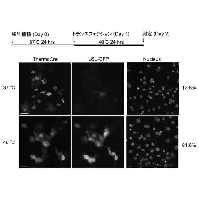光の組織透過能に比べると、超音波およびラジオ波の組織透過能は高く、生体組織深部にまで到達することができ、到達部位領域を加熱することが可能である。そのため、温度変化によって結合および解離を制御し得る温度感応性のタンパク質を利用することで、生体内、特に組織深部における物質の相互作用を、超音波またはラジオ波を利用した加熱によりコントロールする熱遺伝学ツールが利用可能になると考えられる(非特許文献3および非特許文献4)。