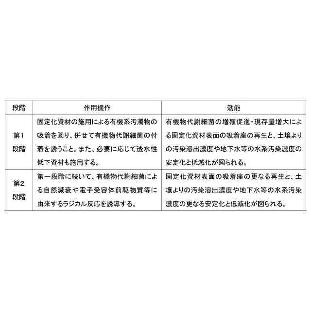 【解決手段】地中構成物に対し固定化資材や必要に応じて透水性低下を図る資材を施用する。係る固定化資材の施用により、一連の操作の端緒として有機系汚濁物を係る資材表面へ吸着せしめ、続いて吸着された有機系汚濁物に対するNAやラジカル生成を介した浄化反応を促し、汚染物質の浄化による資材表面の吸着座の再生を図り、汚染土壌からの汚染物質の溶出濃度、或いは汚染地下水濃度の低減化を図る。また、上記と相まって透水性低下を図る資材を施用することにより、汚染物質の溶出濃度、或いは汚染地下水濃度の一層の低減化を図る。