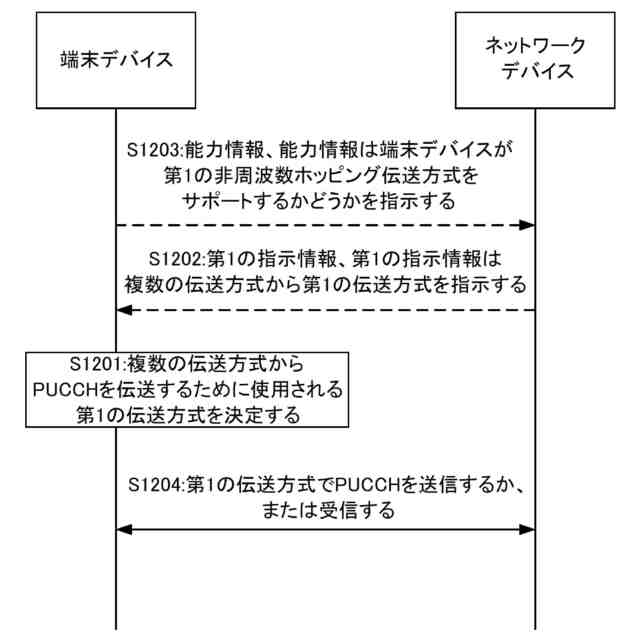 第1の非周波数ホッピング伝送方式は、時間単位内の周波数ホッピングなしでPUCCHを送信することであり、PUCCH上のアップリンク制御情報(uplink control information、UCI)は、第1の部分と第2の部分を含み、第1の部分は長さがL1である直交シーケンスを使用することによって伝送され、第2の部分は長さがL2である直交シーケンスを使用することによって送信され、および/または時間単位内の周波数ホッピングなしでPUCCHを送信することであり、PUCCH上の復調基準信号(demodulation reference signal、DMRS)は第3の部分と第4の部分とを含み、第3の部分は長さがL3である直交シーケンスを使用することによって送信され、第4の部分は長さがL4である直交シーケンスを使用することによって送信され、Li(i=1、2、3、または4)は正の整数である。