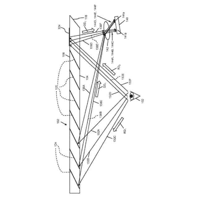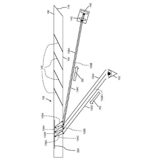 NED、HMD、またはHUDの設計に役立つ可能性のある光学機能は、アイトラッキング、または観察者の眼が頭の方向に対して見ている方向(一般に注視方向と称される)を感知することである。アイトラッキングの様々な解決策が提案されてきた。解決策の1つのセットでは、眼から反射された光をLOEにカップリングインすることによって、眼はLOEを介してEMB内で画像化され、その結果、反射された光は、内部反射によってLOEを通って画像プロジェクタに戻って(すなわち、画像プロジェクタからの画像光に対して逆方向に)伝播する。これらの解決策は、EMBが画像プロジェクタからのコリメートされた画像のように無限大に位置するのではなく、LOEに比較的近い距離に位置するという根本的な問題を克服しようとするものである。別の解決策のセットでは、EMBは、LOEが取り付けられる機械体の周辺部分、例えば眼鏡フレーム上の軸外位置で眼の前に配備された1つ以上のカメラを使用して画像化される。しかしながら、機械体の周辺部分と眼との間の近接性は、比較的大きなキーストーン角度のために、EMB内の眼の画像化を困難にする。明らかに、カメラを眼の前に配備すると、高品質のEMB画像撮影および画像処理が可能になるが、カメラを眼の前に位置決めすると、視認者の自然な視界が不明瞭になる。