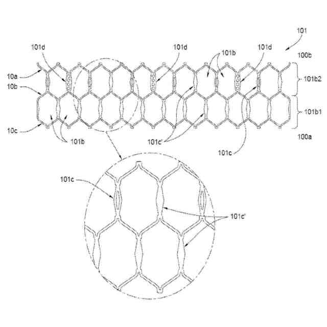 前記中列の角度付きストラット(10b)の谷は、リンクによって前記下列の角度付きストラット(10c)の対応するピークに接続され、各リンクは菱形セル(101c)または菱面体(101d/101c’)を形成することによって、交差した八角形セルを含む上列のセル(101b2)に隣接して、交差した八角形セルを含むセル列(101b1)を形成し、各交連部で菱形セル(101c)または菱面体(101d/101c’)が交互に配置され、菱形セル(101c)は内部が開放構造であり、菱面体(101d/101c’)は内部が中実構造であり、