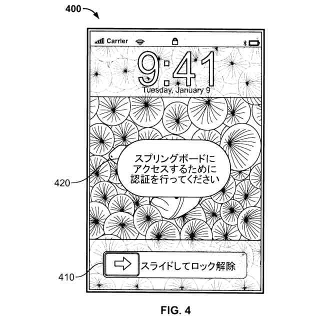 電子デバイス、特に携帯型電子デバイスは、個人情報を格納するために用いられる。例えば、ユーザは、ユーザが用いる連絡先、電子メール、カレンダー情報、文書、および、その他の情報を格納するために、携帯電話、PDA、スマートフォン、または、その他の電子デバイスを用いてよい。この情報は、必ずしも秘密にしなくてもよいが、ユーザは、情報の少なくとも一部を他人に利用できなくするよう望んでもよい。許可されていない人物がユーザの個人情報にアクセスし閲覧することを防ぐ方法の1つとして、デバイス機能を有効にする前、または、デバイスリソースにアクセスする前に、パスワードまたはパスコードの提供を電子デバイスのユーザに要求する方法が挙げられる。例えば、電子デバイスは、デバイスのホームスクリーン(例えば、スプリングボード)またはメニューを表示する前に、4つの数字または4つの文字のPINを入力するよう、ユーザに要求してよい。別の例として、ユーザの指紋を検出するためまたはユーザの網膜を走査するための付属デバイスをデバイスに接続することによって、ユーザが、デバイスへのアクセス権を受ける前に、承認された指紋または網膜を最初に示さなければいけないようにしてもよい。