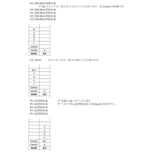 しかしながら、このようなスクリプト言語でプログラムを記述することは、例えば、低レベルプログラミング技術に関連する知識及び熟練を必要とするために、より広いプログラミングコミュニティにより直感的又は直ちに採用できない。これは、プログラマに、スタック及びその中のデータの位置を考慮することを要求する。低レベルオペコードで構成されるプログラムの記述は、C、Java(登録商標)、等のような高レベル言語(high-level language:HLL)でソースコードを記述するより時間及び労働集約的である。このようなHLLのために構築されるコンパイラ/インタープリタは、プログラマをメモリ管理等に関連する多くの面倒な低レベルな問題から遠ざける便利な抽象化レベルを提供する。1つ以上のスタックの中のデータを操作するためのオペコードのシーケンスの記述は、HLLでソースコードを記述するより、技術的に複雑であり且つ時間がかかる。したがって、低レベルオペコードの使用の困難な特性により、エラー及びバグの発生する可能性がより高い。