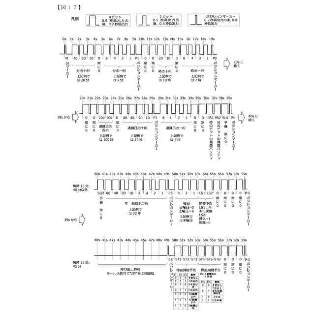 図17は、現在国内で使用されている標準時刻電波の出力フォーマットである。標準時刻電波の出力状態としては、高出力と低出力の二種類のみで、これで3種類の長さのパルス派を形成し、1秒ごとに送信している。パルス長は高出力0.8秒、0.5秒、0.2秒の3種類が存在し、それぞれ、0ビット、1ビット、マーカーを意味する。通常、マーカーは十秒おきに発信されるが、毎分59秒と正分0秒には2回連続して出力される。マーカーとあらかじめ予約されているビット以外には全てパルス長によるビットごとに意味のある数値が割り当てられおり、1ビットのパルス長が観測された場合は割り当てられた数値を加算する。標準時刻電波はこのようにして、1分間に射出される60回のパルスに年月日時分の情報を含めて送信している。つまり、最低2分間の標準時刻電波の観測を行えば、各パルスがどの年月日時秒を意味しているかの判定が可能となる。標準時刻電波の各パルスが、いずれの年月日のどの時刻を示しているかが明らかになることにより、各検知手段で得られた観測データの自系列的な補正が(あるいは同定)が可能となる。図19はデータ補正の概念図である。検知手段A及びBで測定されたデータについて検知手段Bで測定されたデータを時間軸方向に補正することにより検知手段Aで測定されたデータに時刻を揃える手順を示している。この補正後、A、B両検知手段間のデータの相関等を計算することにより、本発明が目指す誤差0.1m以内での漏水箇所の特定が可能となる。みちびき衛星はGPSを補完するために運用されており、その主目的は地球上の位置の特定である。GPSよる地上での位置の特定原理については、本発明とは無関係なので割愛するが、地上での位置を特定するためには同時に最低4基の衛星を捕捉する必要がある。このため、みちびき及びGPS衛星は地上への情報発信に際し、すべての衛星が同一の周波数帯の電波を使用するCDMA(Code Division Multiple Access 符号分割多元接続)方式を採用している。このCDMA方式を採用することにより単一の形式の受信装置ですべての衛星からの電波の受信が可能となっており、送受信装置の回路の規模の縮小やアンテナ構造の単一化等のコスト削減に寄与している。みちびき及びGPS衛星は地上に送出する情報を各衛星に割り当てられたPRN(Pseudo Random Noise code)コードと呼ばれる疑似ランダム符号で符号化処理を行った後に、電波として放出している。よって、特定の衛星の情報の抽出は受信した電波を、目的とする衛星のPRNコードのレプリカを使用して復号化することにより可能となる。(図21)衛星から受信した電波情報の復号に成功すると、GPSの航法メッセージと言われる図23に示した概念のデータが取得できる。GPSの航法メッセージは5つのサブフレームから構成されるフレームという単位が全てとなり、1つのフレームを送信し終えると時系列変化により更新されたフレーム情報を再度送信する、といことを衛星は繰り返し行っている。フレームには衛星の位置や健康状態、時刻の補正係数、他の全衛星の概要情報などが含まれるが、本発明とは関係ないので、時刻情報に関する部分以外の説明は割愛する。1つのサブフレームは300bitで構成され、地上ではこれを6秒かけて受信する。サブフレームの先頭は必ずTLM(Telemetry Word)とそれに引き続くHOW(Hand Over Word)が含まれている。TLMの先頭8bitはPreambleと言われており、2024年7月時点での運用では “10001011”固定されている。HOWの先頭17bitはTOW-COUNT MESSAGE呼ばれる直前の日曜日の0時を起点とする6秒単位の時間であり、次のサブフレームが送信される時刻を示している。第一フレームの先頭10bitはWeek Numberで、2019年4月7日からの週番号となっている。これらの情報から、地上の検知手段は現在受信している西暦、月日、時刻を取得することが可能となる。なお秒パルスについては搬送波にロックし、その位相の反転を検知し生成したほうがより高精度となる。また、標準時刻電波の前半30秒は国際的に共通の仕様であるため、国外での使用を考慮し、標準時刻電波の形式に変換する際には、時刻情報が衛星電波であることの識別子として、1分データ中の後半30秒のマーカー以外の任意の部分に「GNSS」等のコードをモールス信号形式等2進化した形で埋め込む。十万分の一秒単位の弾性波データを例えば8ビットの分解能で取得した場合、一秒間に取得するデータ量は800Kビットとなる。これに時刻信号を加えるのだが、標準時刻電波は高出力と低出力の二状態しかないため、1ビットで表現可能である。ただしパルスの立ち上がりの55%値が標準時の1秒信号となっているため、データの取得は8ビット程度で行い、最低値と、最高値の55%をしきい値に送信前に1ビット化を行うのが適切である。8ビットの弾性波データと時刻信号データを合わせて1検知手段につき毎秒900Kビットしてのデータ量になる。現在の技術でデータを圧縮して平均5分の1程度の容量180Kビットにできたとしても、現行の