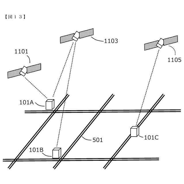本発明の実施による効果は以下のようになる。まず、標準時刻電波の時刻信号の利用により、漏洩位置の正確な特定が迅速かつ安価に行える漏洩検知装置の実現がある。また、長波帯の標準時刻電波は世界各国で既に実用化されているため、いわゆるFMラジオの機能を検知手段に搭載しておけば海外でも即座に使用が可能となる利点がある。準天頂衛星「みちびき」は米国が運用しているGPS(Global Positioning System)を補完する役割を担うものとして日本が打ち上げ、運用を行っている。主目的は測位時間の短縮および測位精度を向上であり、衛星から送信されるデータフォーマットはGPSに準拠したものとなっている。衛星の軌道は図11の701に示す様に日本から赤道をまたぎ、オーストラリアまでを含む変形八の字形をしている。図11中の705は広域エリアの受信帯で、東経90度~180度、北緯60度~南緯60度の地域が該当する。703は日本近傍エリアの受信帯であり、東経110度~160度、北緯22度から60度の地位が該当する。日本近傍エリアでは仰角70度以上に常に1基以上の衛星が飛行しているようスケジューリングされており、すでに現在の運用状態でも高精度の時計信号源として十分活用できる。「みちびき」から発信される電波を時計信号源とし利用するメリットの一つが、同一信号源の確保である。例えばGPS信号を時計信号源とし利用すると想定し、検知手段を広範に設置した場合、全検知手段が必ず同一の衛星を捕捉する保証はなく、また電波状態によっては計測の途中で時計信号源を受信する衛星が切り替わってしまう可能がある。図13衛星の電波の捕捉例を示したものだが、図中の1101、1103、1105はそれぞれGPS衛星A、B、Cを表している。本図では検知手段Aは当初GPS衛星Aからの電波を受信したが、電波状況等の変化により途中からGPS衛星Bからの電波を受信するように切り替え、検知手段BはGPS衛星Bからの電波のみを受信し、同様に検知手段CはGPS衛星Cからの電波のみを受信した場合を示している。このような受信状態では同一の信号源を確保しているとは言い難い。GPSを始めとしたGNSS衛星はルビジウムやセシウムを使用した原子時計を内蔵しており時刻の精度は極めて高く、また地上基地から定期的に世界標準時刻への校正が行われている。しかし個々の衛星の時計精度が優れていても、複数の衛星同士間での精度の保証はない。本発明の根幹は全検知手段が同一の時刻信号源を有していることであり、例えその時刻自体が地上時刻と一致していなくても大きな問題はない。このため、同一の衛星からの電波を全検知手段が受信できる可能性が極めて高い「みちびき」の利用が重要になる。「みちびき」を利用するもうひとつメリットはその高仰角である。図15は検知手段が直接は見通せない衛星の電波を、反射波として受信してしまった事例を示している。図で示した事例以外にも、屈折や回析による直接波以外の電波を受信することもある、電波の速度が光速であることを考慮すれば直接波との伝搬距離の差が時計精度に与える影響はわずかなものだが、できる限り時刻精度を高めるためには、このような状況は避けたい。市販の衛星受信機の中には直接波以外の電波の受信を除外する機能を有した製品もあるが、機構が複雑で当然コストが高くなる。「みちびき」は仰角が70度以上と非常に高いため、狭隘な谷間や、高層建築群の中でも直接波を受信できる機会が増え受信器の低コスト化につながる。打鍵音により各検知手段間の距離を正確に計測すれば、路上で巻き尺等を使用した計測作業が一切不要となり、検知手段の設置範囲を広範にとることも容易になる。また、検知手段の位置を移動させてトライアンドエラーの様な形で漏洩個所を絞り込んでいく際にも検知手段間の距離の再計測の手間が一切なくなるため、作業効率が飛躍的に向上する。デジタル化された防災行政無線の疎通範囲はかなり広域に及ぶため、規格に沿った通信装置を使用すれば電波障害等の影響を考慮することなく、各検知手段と解析用パーソナルコンピューター間のデータの伝送が速やかに行える。さらには、無線基地局で各検知手段からの信号を集約すれば、漏洩監視センターのような常設の設備の運用にまで発展させることも可能である。なお、これらの設備にかかる経費や維持費は既に無線インフラが整備されている市区町村については検知手段に装備する通信装置の費用のみで済むというメリットがある。