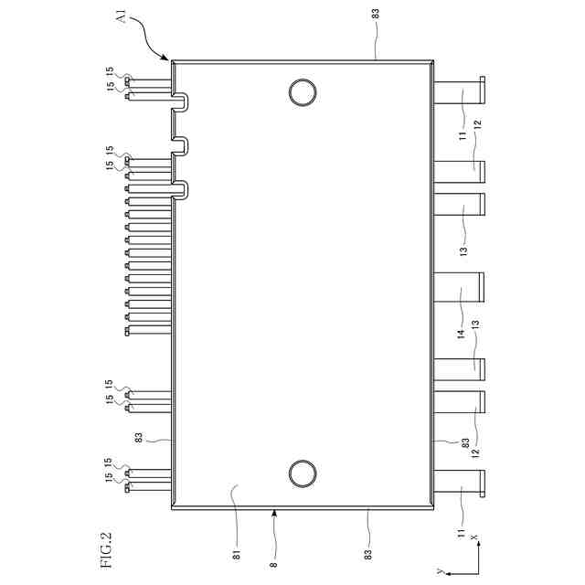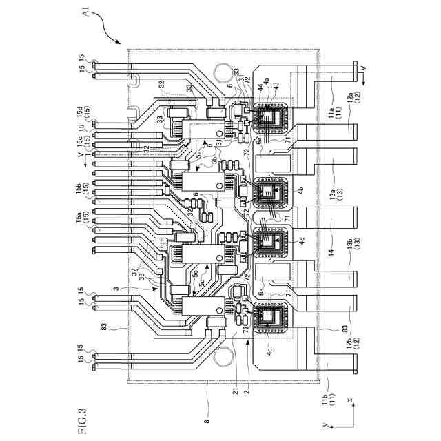 【解決手段】半導体装置A1は、基板2と、基板の主面21上に形成された導電部と、基板の主面上に配置された半導体チップと、半導体チップを制御する制御装置と、封止樹脂と、導電部に接合され且つ一部が封止樹脂から露出した第1リード15aと、を備える。導電部は、互いに離間して配置された第1パッド32aと、第2パッド32bと、を含む。第1リードは、第1パッド及び第2パッドに接合されている。これにより、接続配線を介して第1パッドに入力されたノイズは、第1リードから外部に放出される。よって、第2パッドおよびこれに接続する接続配線を介してノイズが他の電子部品に入力されることが抑制される。したがって、1個のパッドに第1リードが接合される場合と比較して、ノイズによる影響が抑制される。