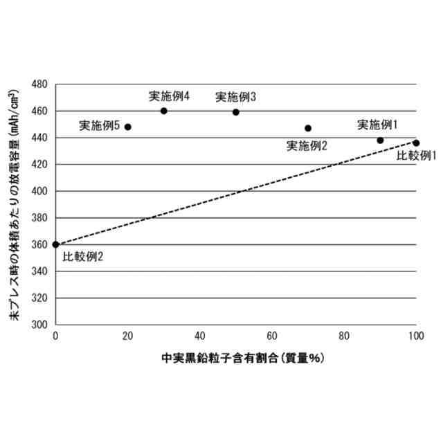 図3は、実施例及び比較例における中実黒鉛粒子の含有割合と負極活物質層の体積あたりの放電容量との関係を示すグラフである。