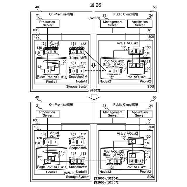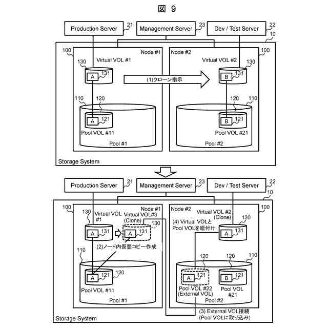 【解決手段】方法は、第1のノードが、仮想ボリュームとプールとのアドレスマッピングのコピー(仮想コピー)を第1の仮想ボリュームについて行うことで第3の仮想ボリュームを第1のノード内に作成し、第2のノードが、第2のノードにおける第1のプールボリュームから第1のノードの第3の仮想ボリュームへマッピングを行い、第3の仮想ボリュームにマッピングされた第1のプールボリュームのアドレスを第2のノードにおける第2の仮想ボリュームのアドレスに1対1で紐付け、第2の仮想ボリュームにおけるデータのログストラクチャー方式の書き込みを第2のノードにおける第2のプールボリュームに対して行う。