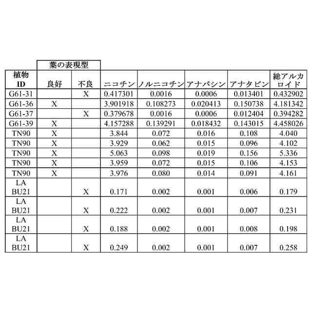 昆虫からの防御におけるアルカロイドの役割に合致して、LA BU21は昆虫による損傷に対して極めて感受性であることが報告された(Legg et al.、Crop Science、10:212(1970)(非特許文献1))。低い総アルカロイドパーセンテージ(約0.20%)を有する熱風乾燥タバコの同質遺伝子株をそれらの「正常」な回帰性(recurring)の親(総アルカロイド1.85~2.70%)と比較したさらなる研究は、低アルカロイド株における収率、グレード指数、総N、および還元糖含有量は正常な熱風乾燥栽培品種におけるより低いことを報告した(ChaplinおよびWeeks、Crop Science、16(3):416-18(1976)(非特許文献3))。