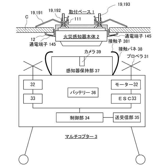 【解決手段】本発明の一実施形態におけるマルチコプターは、上部に、火災感知器本体を保持可能な感知器保持部と、接触バネとを備え、前記接触バネは、所定の電圧を付与されている接触子を有し、前記接触子は、前記火災感知器本体が取付けられる取付ベースの通電端子と接触して電流を供給する、ことを特徴とする。