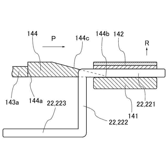 図3に火災感知器本体2の上面図を示す。火災感知器本体2には、感知器背面板21の対向する位置に2つの刃金具22が取り付けられている。図4に、図3で示した刃金具22の拡大図を示す。図4(a)は、刃金具22の上面図であり、図4(b)は、刃金具22の側面図である。刃金具22は、一枚の導体板を折り曲げて接触部221、中間部222、固定部223とした構成となっている。接触部221と中間部222の間は一方向に折り曲げられ、中間部222と固定部223の間は逆方向に折り曲げられている。固定部223には、固定ネジ孔224が設けられている。固定ネジ孔224にネジを螺入することにより固定部223を感知器背面板21に固定して、刃金具22が感知器背面板21に固定される。