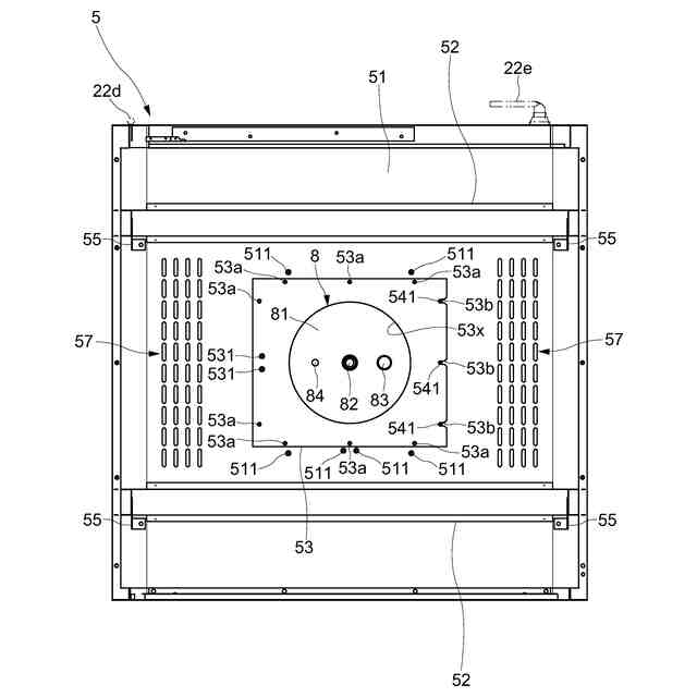 この種の下方放出型自動消火装置は、消火剤貯蔵容器の下面に消火剤噴射ノズル等を一体的に設けたものが一般的であり、この消火剤貯蔵容器を、例えば、カバー内に収容し取り付けた状態で、そのカバーを消火剤貯蔵容器及び消火剤噴射ノズル等とともにブースの天井の外面に取り付けるようにしている。すなわち、従来のものは、天井板の上面に外部空間側から消火装置を取付ける必要がある。