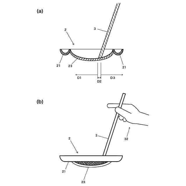 (3)柄と、柄の後方の灰汁除去部との間にある網は、灰汁を通過させることができるので、器部の内側から灰汁を除去することができる。