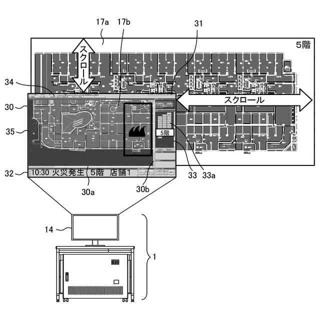 従来、総合操作盤を構成する火災報知設備の表示装置は、建物の防災センター等に設置されている。火災報知設備の表示装置は、煙感知器等の複数の端末機器が接続された火災受信機に接続されており、各端末機器の状態情報を火災受信機から受信できるように構成されている。特許文献1の火災報知設備の表示装置は、各種画像や各種情報を表示する表示部と、複数の端末機器のシンボルが配置された平面図の画像データを記憶する記憶部とを備えている。特許文献1の火災報知設備の表示装置は、平常時は「平常監視中」という文字を表示部に表示し、火災受信機からの状態情報に基づいて煙感知器の状態変化(発報)等のイベントの発生を確認すると、表示部の画面をイベント発生画面に切り替えて表示する。イベント発生画面には、各端末機器のシンボルが配置された平面図が表示され、イベントが発生した端末機器を、他の端末機器と識別できるようシンボルが色変え・点滅して表示されている。