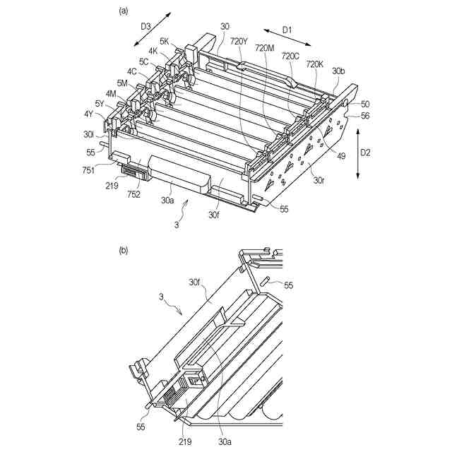 また、カートリッジトレイが有する感光ドラムのドラム回転軸線上に延びる方向をD1方向(第2方向)とする。更に、D1方向に対して交差する方向(本実施形態では、カートリッジトレイに対する現像カートリッジの挿入方向)をD2方向(第3方向)とする。加えて、カートリッジトレイが画像形成装置内に挿入される方向をD3方向(第1方向)とする。D1方向とD2方向とは、互いに交差もしくは直交する。D2方向とD3方向とは、互いに交差もしくは直交する。D3方向とD1方向とは、互いに交差もしくは直交する。本実施例において、D2方向は鉛直方向であり、D3方向は、D1方向とD3方向の双方に直交する方向である。
