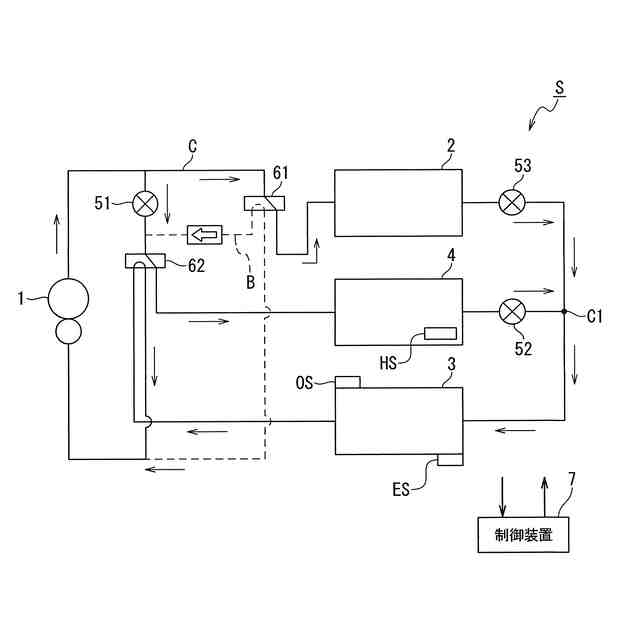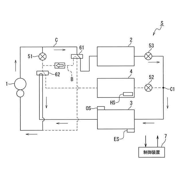 冷媒回路に蓄熱装置が設けられている場合において、例えば暖房運転を行う場合、圧縮機から吐出された冷媒は、室内熱交換器で凝縮される。すなわち、当該室内交換器は凝縮器として機能して室内の空気と冷媒とが熱交換することにより、室内に温風を供給する。室内熱交換器から流出した冷媒は、膨張弁を介して室外熱交換器に流入し、圧縮機に流入する。