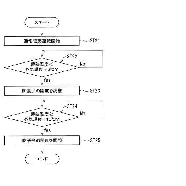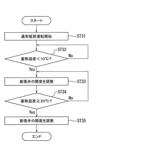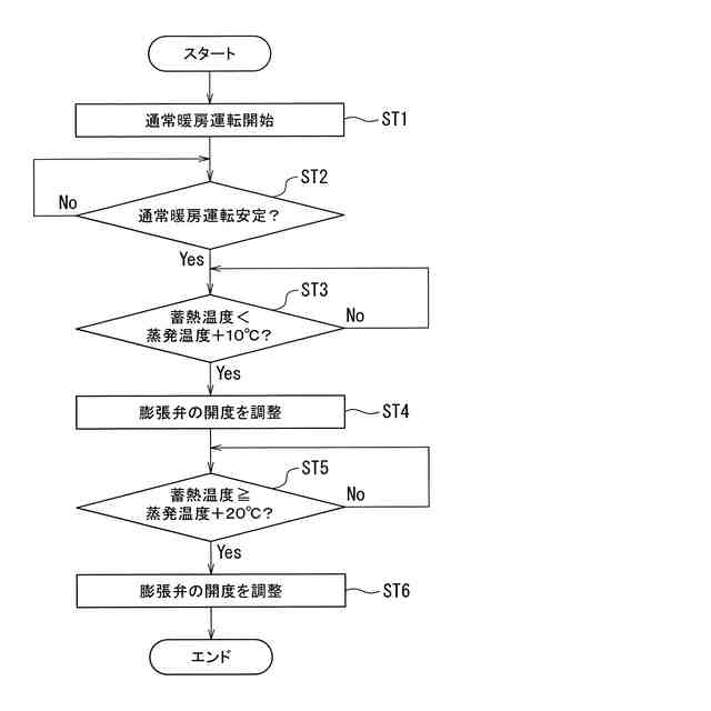 このような暖房運転の場合において、特に蓄熱装置において冷媒と蓄熱材との熱交換を行う必要がない場合には、圧縮機から蓄熱装置に冷媒を流す必要はない。そこで、圧縮機と蓄熱装置との間に設けられる膨張弁を閉じることで、圧縮機から吐出された冷媒が蓄熱装置に流入することを防止している。