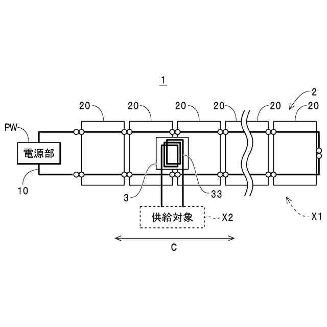 このような構成では、レールに沿って移動体(供給対象)と共に受電用コイルを移動させたときに、受電用コイルが導体パターンの長手方向における中央部に位置しているとき(接続部から離間しているとき)と、受電用コイルが接続部の近傍に位置しているとき(導体パターンの端部に位置しているとき)とで、受電コイルにおける磁界の結合の度合いが相違し、受電用コイルに生じる誘導起電力が相違することとなる。この結果、移動体の位置(すなわち、送電用コイルに対する受電用コイルの位置)によって電力の伝送効率が変化するため、移動体(供給対象)に対して安定して電力を供給するのが困難となる。したがって、この点を解決する必要がある。