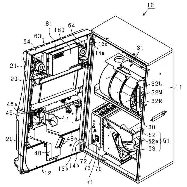 前面扉を開いた状態を示すスロットマシンの斜視図である。