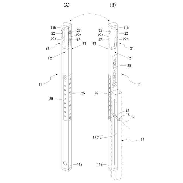 前記中間姿勢(P2)から前記ガイド手段(17)の摺動を介して先端部(11b)を受側の手掛かり棒(13)に重ねることにより前記使用姿勢(P3)とされ、