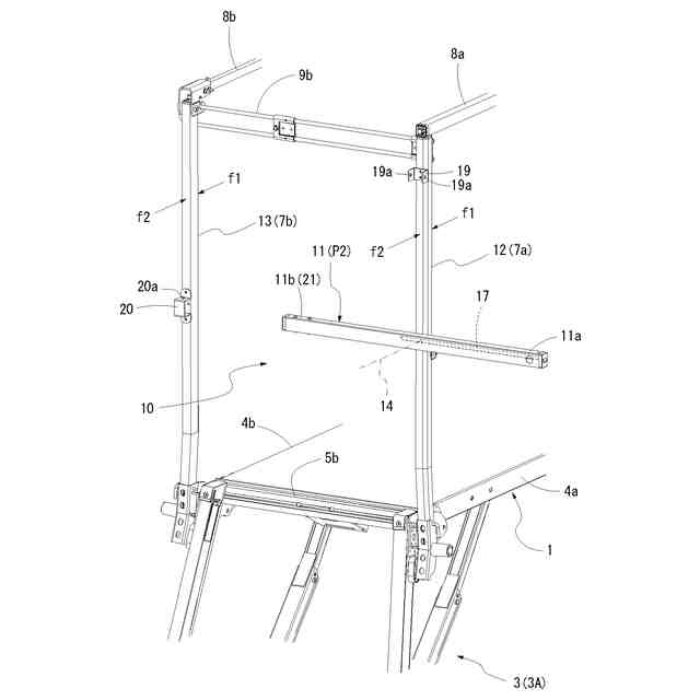 第1桁縁部の両端近傍に位置する一対の手掛かり棒(6a,7a)の上端部を相互に連結する第1桁側安全バー(8a)と、第2桁縁部の両端近傍に位置する一対の手掛かり棒(6b,7b)の上端部を相互に連結する第2桁側安全バー(8b)が設けられており、