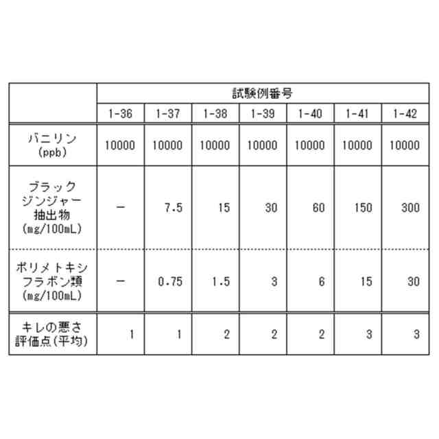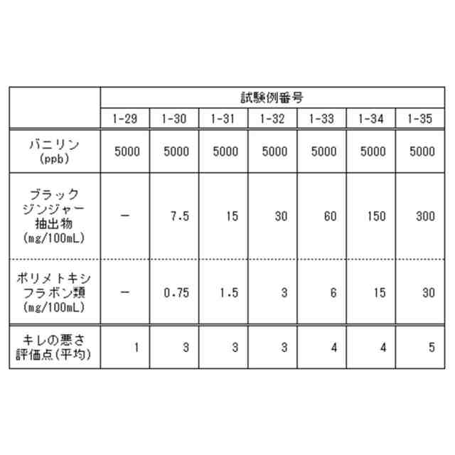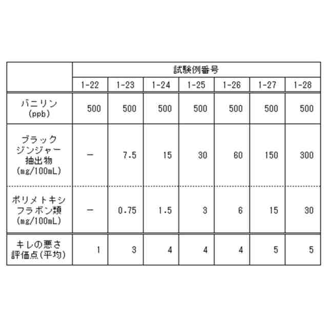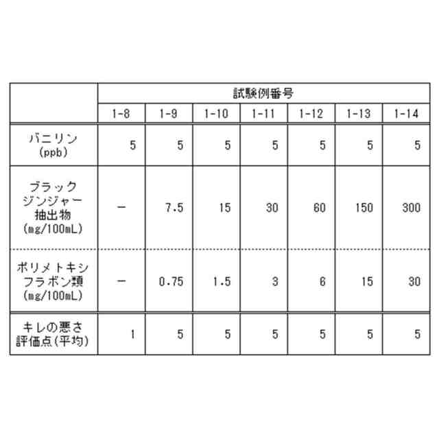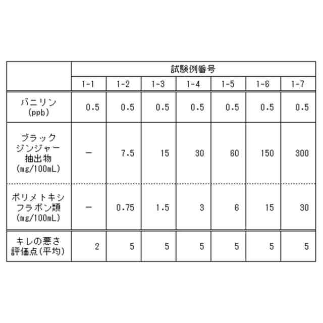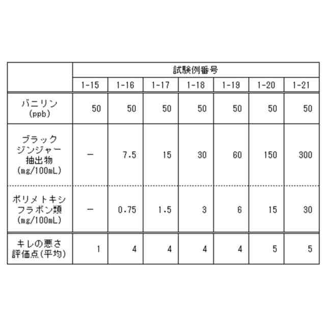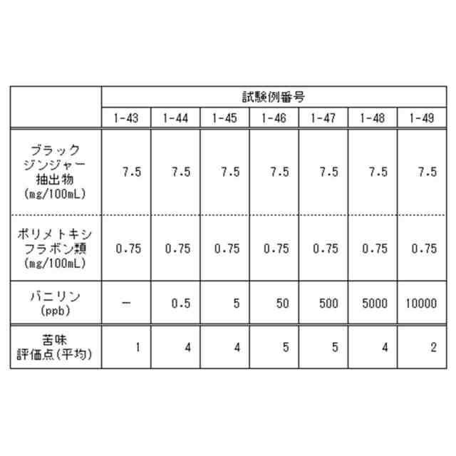 前記課題を解決するために本発明者らが鋭意検討を重ねた結果、飲食品における前記ポリメトキシフラボン類の苦味抑制に関して、バニリンに非常に優れた効果があること、また、バニリンを用いてもバニリンのキレの悪さが生じないことを見出した。なお、バニリンのキレの悪さとは、バニリンを含む飲食品を喫食した後に、べたりとした感覚でバニリン特有の香りが鼻に残ることをいう。