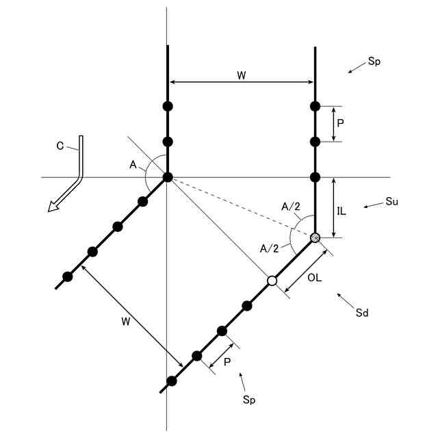 このため、従来の二本針ミシンでは、上流側追加縫い目Suに到達する直前まで二本針縫いを行い、上流側追加縫い目Suの形成開始位置で片針縫いに切り替えて屈曲部の頂点まで片針縫いを行う。さらに、屈曲部の頂点で片針の針落ち状態でミシンを停止させて、屈曲角度Aに従って被縫製物を回動させてから、片針縫いで下流側追加縫い目Sdを形成し、下流側追加縫い目Sdの終了位置で二本針縫いを再開するという縫製が行われていた(例えば、特許文献1,2参照)。