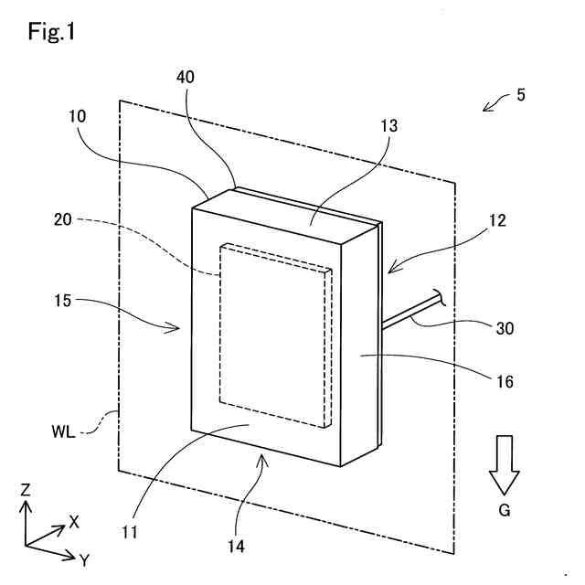 筐体10は、直方体状に構成されている。筐体10は、正面11と、背面12と、上面13と、底面14と、左側面15と、右側面16とを有している。筐体10は、背面12が壁面WLを向き、かつ、底面14が重力方向Gを向くように、壁面WLに固定されている。本実施形態では、筐体10は、固定部材40を介して壁面WLに固定されている。本開示において、筐体10が壁面WLに固定されていることには、筐体10が壁面WLに直接固定されていることだけではなく、筐体10が固定部材40を介して壁面WLに固定されていることが含まれる。