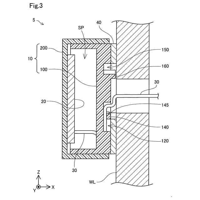 図1は、第1実施形態における筐体10を備える電子機器5の斜視図である。図2は、電子機器5の背面図である。図3は、図2におけるIII-III線断面図である。図1に示すように、電子機器5は、筐体10と、回路基板20と、ケーブル30と、固定部材40とを備えている。電子機器5は、例えば、インターフォンやICカード式電気錠用カードリーダなどのセキュリティ機器であり、屋外の壁面WLに筐体10が固定された状態で用いられる。