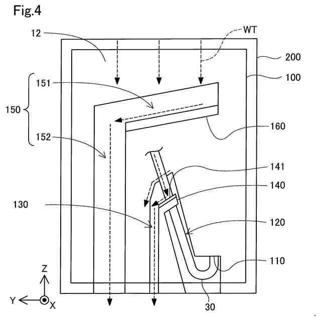 (5)上記形態の筐体において、前記固定部材は、前記ケーブルが通る開口部を有し、前記開口部の下縁部は、前記背面に垂直に視たときに前記リブに重なる部分と前記排水溝に重なる部分とを有し、前記リブから前記排水溝に近付くほど位置が低くなるように傾斜してもよい。