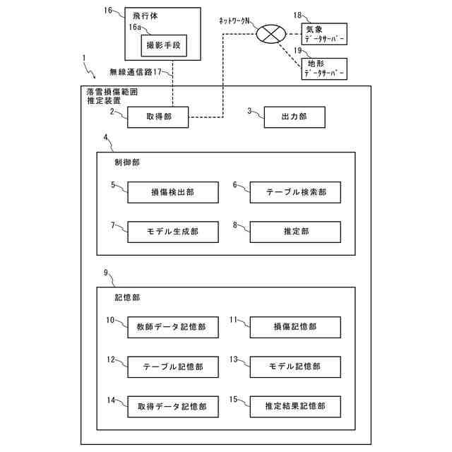 上記目的を達成するため、第1の発明は、地上に存在する構造物の、送電設備からの落雪に起因する落雪損傷範囲を推定する落雪損傷範囲推定装置であって、飛行体に搭載される撮影手段が、積雪前に、構造物が含まれる地上の領域を撮影して取得した積雪前画像と、構造物の周囲での積雪時における気象条件と、送電設備を構成する電線の積雪時における特徴要素を入力データとし、落雪損傷範囲を出力データとする教師データから機械学習を行い、モデルを生成するモデル生成部と、モデルに基づいて、撮影手段が、融雪後に、領域を撮影して取得した融雪後画像と、所定の積雪時における気象条件と、所定の積雪時における特徴要素を含む推定用入力データに対応する、落雪損傷範囲を推定する推定部を備えることを特徴とする。
