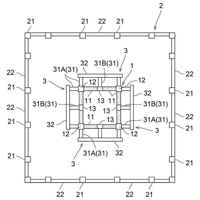 そして、従来、中間梁は、コア構造部と外周架構部の外周柱とに亘る一対の大梁の中間部どうしの間に架設されていた。