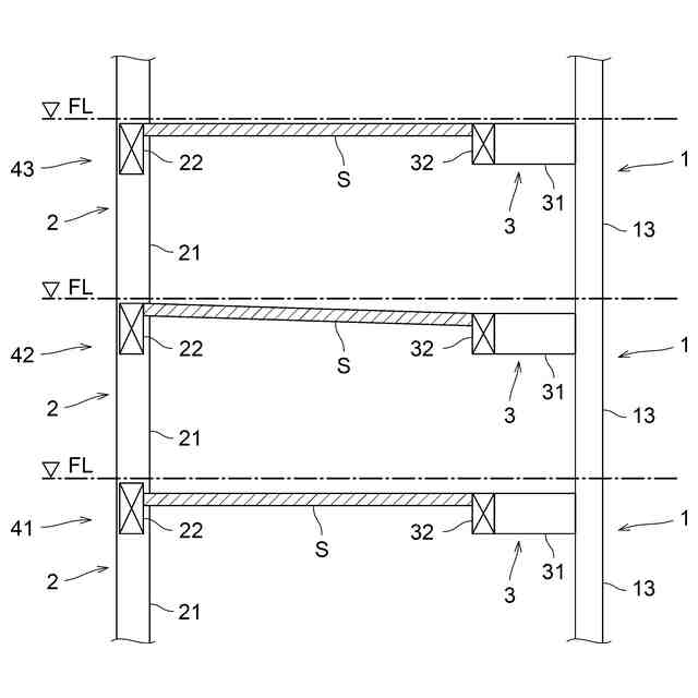 このようなセンターコア型の建物構造では、コア構造部から外周架構部までの間隔が大きい場合、床スラブを適切に支持するべく、コア構造部と外周架構部との間の中間位置で床スラブを支持する中間梁が設けられることがある。