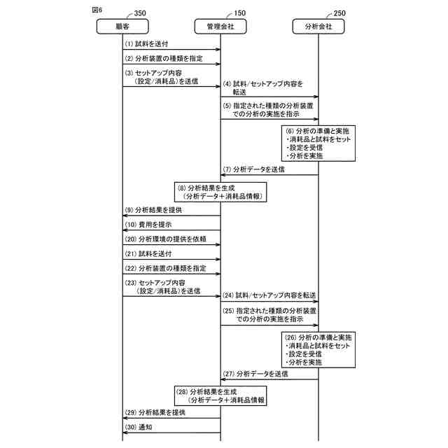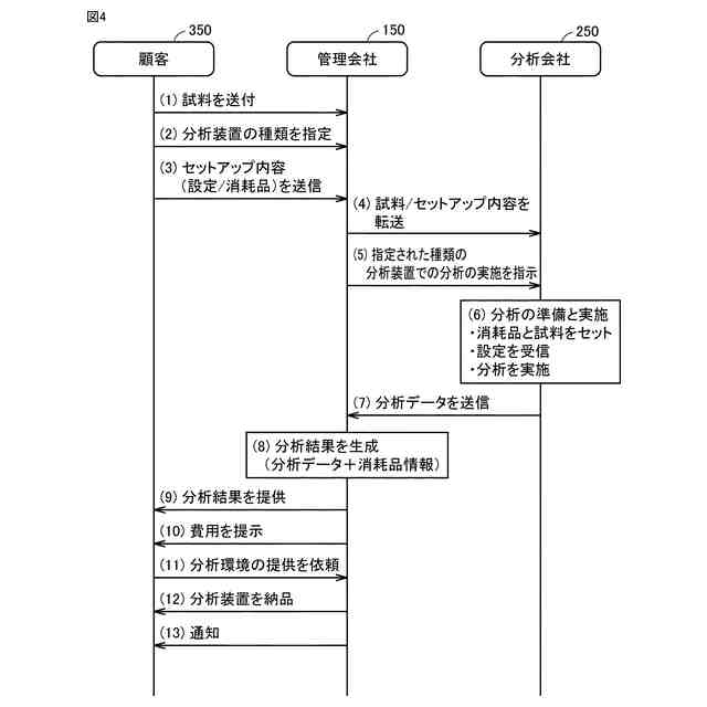 本開示に係る方法では、管理会社150は、顧客350から、分析装置の指定を取得する。管理会社150は、顧客350に向けて、分析装置による、試料の分析データを含む分析結果を提供する。管理会社150は、分析結果の提供の後、顧客350から、分析装置を含む分析環境の提供の依頼を取得する。
