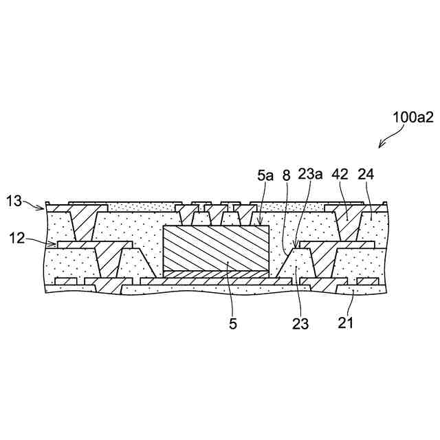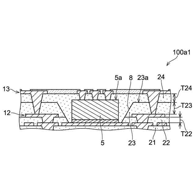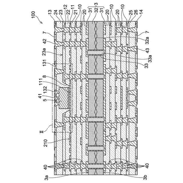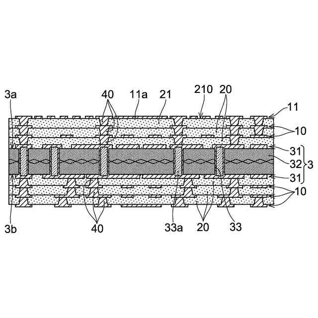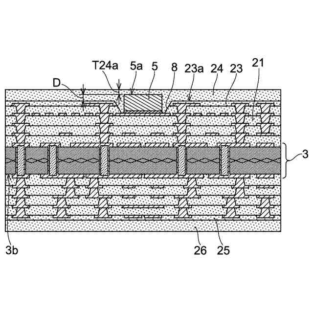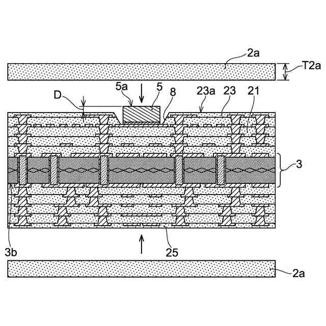 図1に示されるように、部品内蔵基板100は、コア基板3と、コア基板3におけるその厚さ方向において対向する2つの主面(表面3a及び表面3b)それぞれの上に交互に積層されている絶縁層及び導体層と、を含んでいる。コア基板3は、絶縁層32と、絶縁層32の両面それぞれの上に形成されている導体層31と、を含んでいる。コア基板3は、さらに、絶縁層32を貫通して絶縁層32の両面の導体層31同士を接続する筒状のスルーホール導体33を含んでいる。筒状のスルーホール導体33の中空部は、一例としてエポキシ樹脂などによって構成される充填材33aで充填されている。