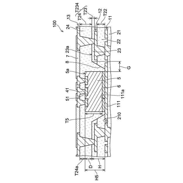 本発明の一実施形態(第1実施形態)の部品内蔵基板が図面を参照しながら説明される。図1には、本実施形態の部品内蔵基板の一例である部品内蔵基板100の断面図が示されており、図2は、図1のII部の拡大図を示している。なお、図1及び図2に示される部品内蔵基板100は実施形態の部品内蔵基板の一例に過ぎない。実施形態の部品内蔵基板の積層構造は、部品内蔵基板100の積層構造に限定されず、実施形態の部品内蔵基板の導体層及び絶縁層それぞれの数は、部品内蔵基板100に含まれる導体層及び絶縁層それぞれの数に限定されない。すなわち、実施形態の部品内蔵基板は、部品内蔵基板100が有する絶縁層及び導体層に加えて、任意の数の絶縁層及び導体層を含んでもよく、部品内蔵基板100が有する絶縁層及び導体層の全てを含まないこともある。なお、以下の説明で参照される各図面では、開示される実施形態が理解され易いように特定の部分が拡大して描かれていることがある。従って、各構成要素が、大きさや長さに関して互いの間の正確な比率で描かれていない場合がある。