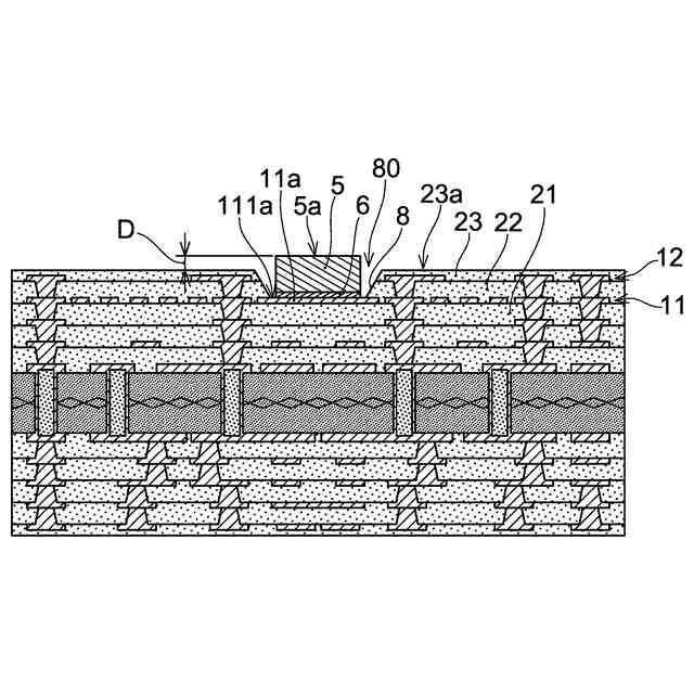 前記第2絶縁層の上に積層されている第3絶縁層と、を備えている。そして、前記凹部が前記第3絶縁層の構成材料で充填されており、前記部品における前記第1絶縁層側と反対側の表面は、前記第2絶縁層における前記第1絶縁層側と反対側の表面に対して、前記第1絶縁層側と反対側に位置している。