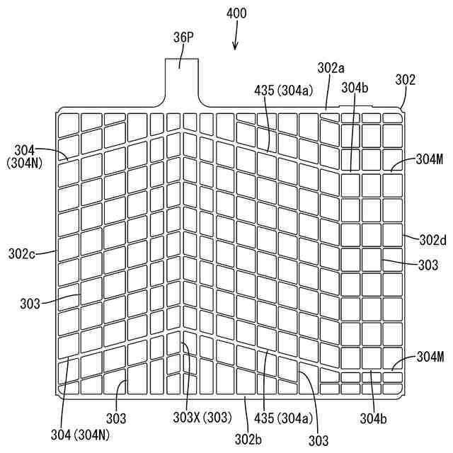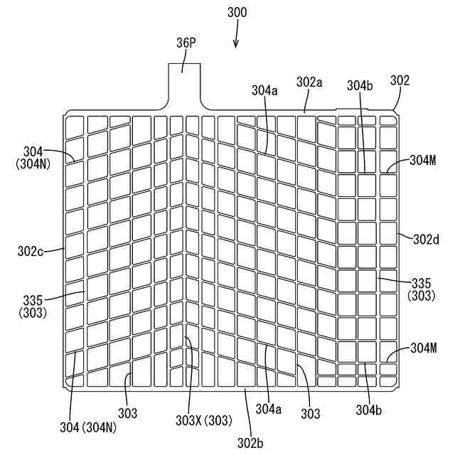 上記の格子では、格子ロールから各格子を切り出す際、切断する位置が隣り合う二つの格子のそれぞれの枠骨の境界となる。その際に、それぞれの枠骨の幅が均等となるように切断することが好ましいが、切断精度が低いと、枠骨の幅がばらつくことになり、格子の歩留まり低下の一因になる。