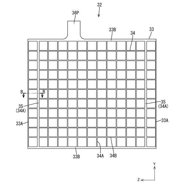 前記集電体は、前記集電体の外周部分を構成する枠骨と、前記枠骨内において格子状に架け渡された内骨と、を備え、