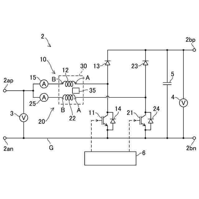 多相コンバータ2は、入力端2ap、2anと、出力端2bp、2bnを有している。多相コンバータ2は、入力端2ap、2anに印加された電圧を昇圧して出力端2bp、2bnから出力することができる。2個の電圧コンバータ回路10、20は、入力端2ap、2anと、出力端2bp、2bnの間に並列に接続されている。入力端の負極2anと出力端の負極2bnは、グランドGで接続されている。2個の電圧コンバータ回路10、20を並列に接続することで、多相コンバータ2は、大電力を扱うことができる。