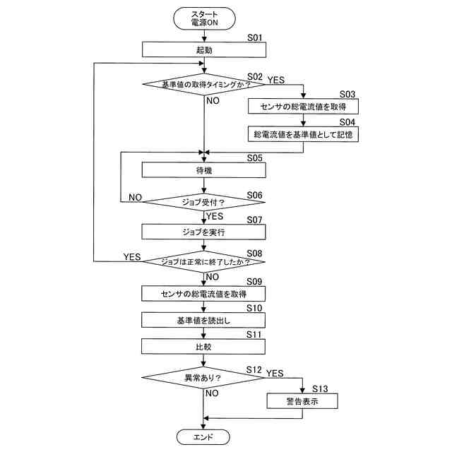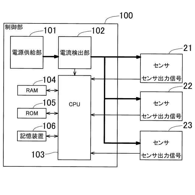 【解決手段】画像形成装置1内の状態を検出する複数のセンサ21~23と、複数のセンサに対して電力を供給する電源101と、電源から複数のセンサへ供給される電流値を検出する電流検出部102と、複数のセンサが正常な状態において電源から複数のセンサへ供給される電流値を基準値として取得する取得部103と、電流検出部102により検出した電流値と基準値を比較することにより、複数のセンサに関して正常か否かを判定する判定部102と、を有する画像形成装置1である。