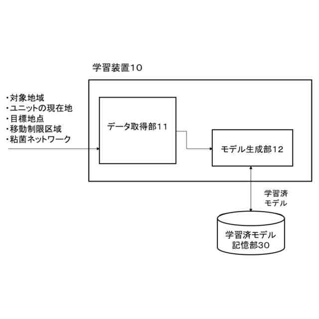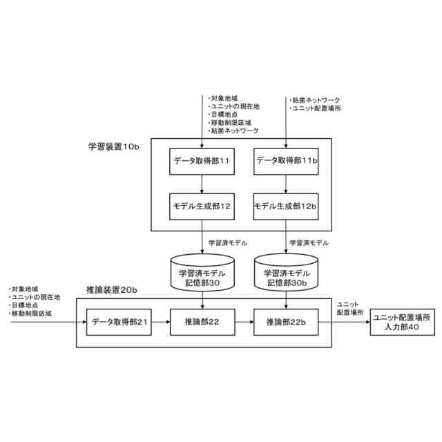 前記対象地域、前記現在地、前記目標地点、及び前記移動制限区域を入力として前記現在地と前記目標地点を結ぶ粘菌ネットワークを推論するための学習済モデルに基づいて、前記対象地域内で前記移動制限区域を避けて前記現在地及び前記目標地点を結ぶ粘菌ネットワークを作成し、前記粘菌ネットワーク上における、前記ユニットが前記現在地から前記目標地点に移動を開始するまでの待機場所であるユニット配置場所を出力する推論部と、