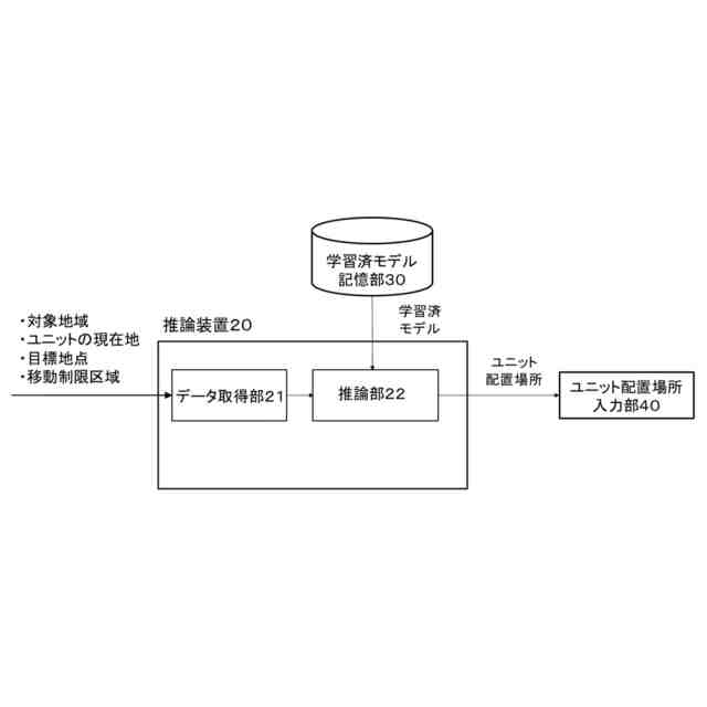 ユニットが行動する対象地域、ユニットの現在地、ユニットの移動における複数の目標地点、及び移動制限区域の情報を取得し、現在地から複数の目標地点への経路を推論するための学習済モデルに基づいて現在地から複数の目標地点までの複数の経路を算出し、複数の経路の交差点を、ユニットが複数の目標地点のいずれかに移動を開始するまでの待機場所であるユニットの配置場所として出力する推論部を備える。