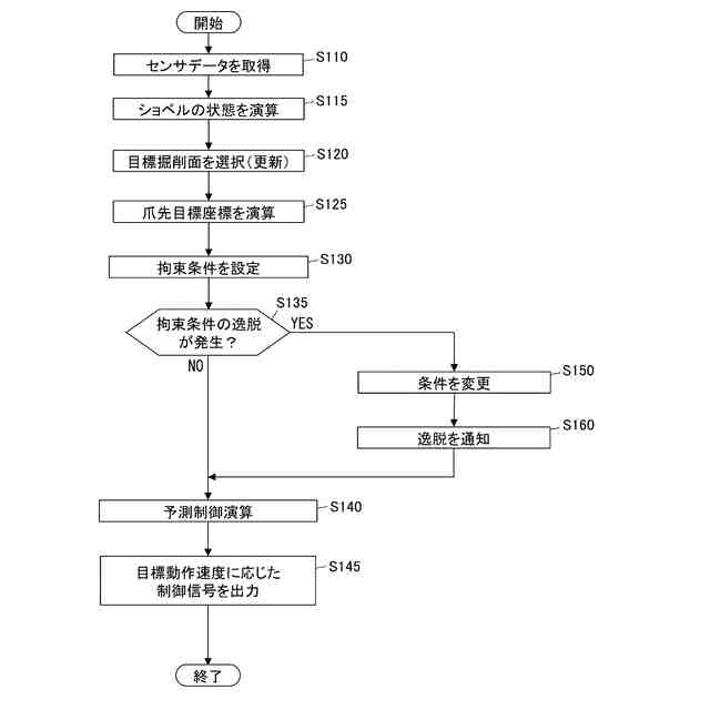 バケットの爪先の座標の算出結果が目標掘削面の下に位置している状況では、モデル予測制御において拘束条件の逸脱が発生していると考えられる。拘束条件の逸脱が発生した場合、拘束条件の逸脱から早期に回復させようとしてモデル予測制御が実行され、バケットが急動作する可能性がある。また、拘束条件を満足しない状態を初期状態として最適化演算を行う場合、最適化の繰り返し演算において想定外の挙動を生じ得る。つまり、拘束条件の逸脱が発生すると、作業機械の動作が不安定になるおそれがある。