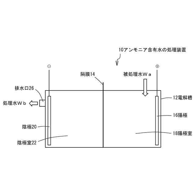 【解決手段】アンモニア含有水を入れて電解処理する電解槽12を備え、電解槽12の中に隔膜14を有し、電解槽12は直流電源のプラス側に接続した陽極室18と、隔膜14を介して陽極室18に隣接した陰極室22を備える。陽極室18は陽極16を備え、陰極室22は陰極20を備える。隔膜14は多数の微小な通水孔であるスリットを備える。スリットは、層流状態で通水し乱流による拡散を生じさせない大きさであって、アンモニア含有水のアンモニアが除去された処理水Wbが通過可能な大きさである。