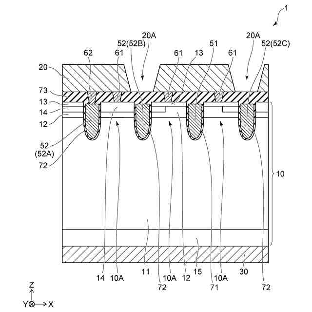 半導体層10は、第3方向Zにおいて、第1電極20と第2電極30との間に位置する。半導体層10は、第1方向Xに並び、第2方向Yに延びる複数のメサ部10Aを有する。第1方向X及び第2方向Yは、第3方向Zに垂直な面内で互いに直交する。半導体層10は、例えば、シリコン層である。半導体層10は、炭化シリコン層、または窒化ガリウム層であってもよい。本明細書では、半導体層10の導電型において、第1導電型をn型、第2導電型をp型として説明するが、第1導電型をp型、第2導電型をn型としてもよい。