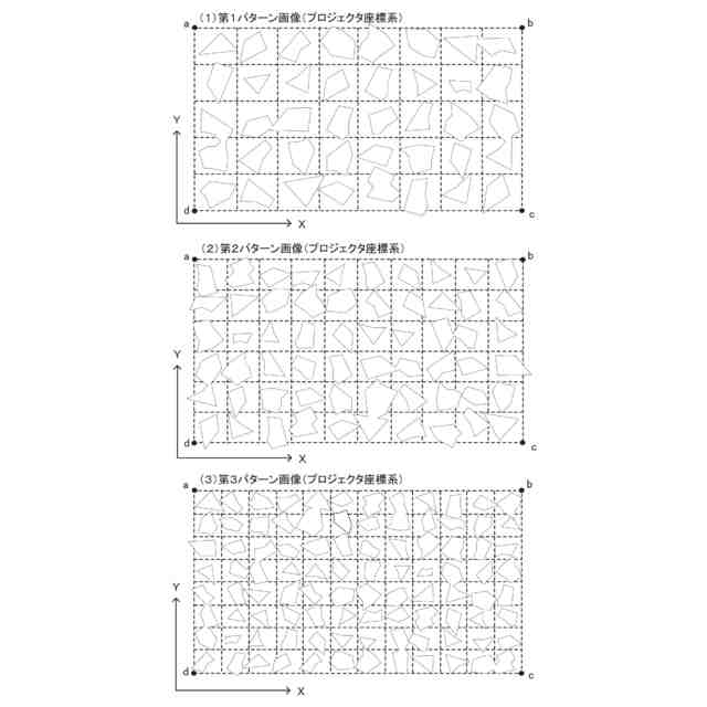 前記投影処理において、前記投影装置に、配置される各多角形の形状又は/及び位置が互いに異なる複数の前記パターン画像を前記フィールドの表面に順に投影させ、