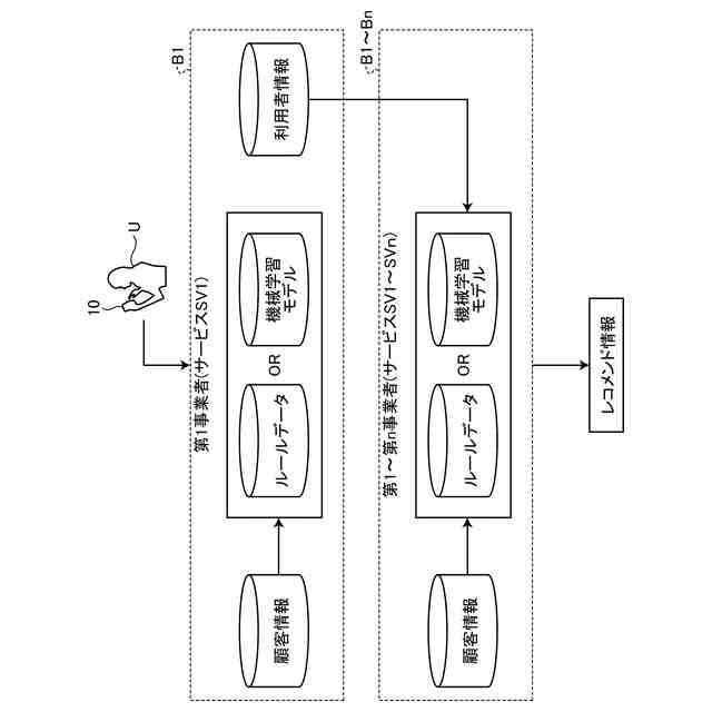 前記決定部は、前記所定の情報サービスのうち、前記第1事業者とは異なる第2事業者が提供する第2の情報サービスで管理される管理情報と、前記利用者情報とに基づいて、前記第2の情報サービスに対応するレコメンド情報を決定する